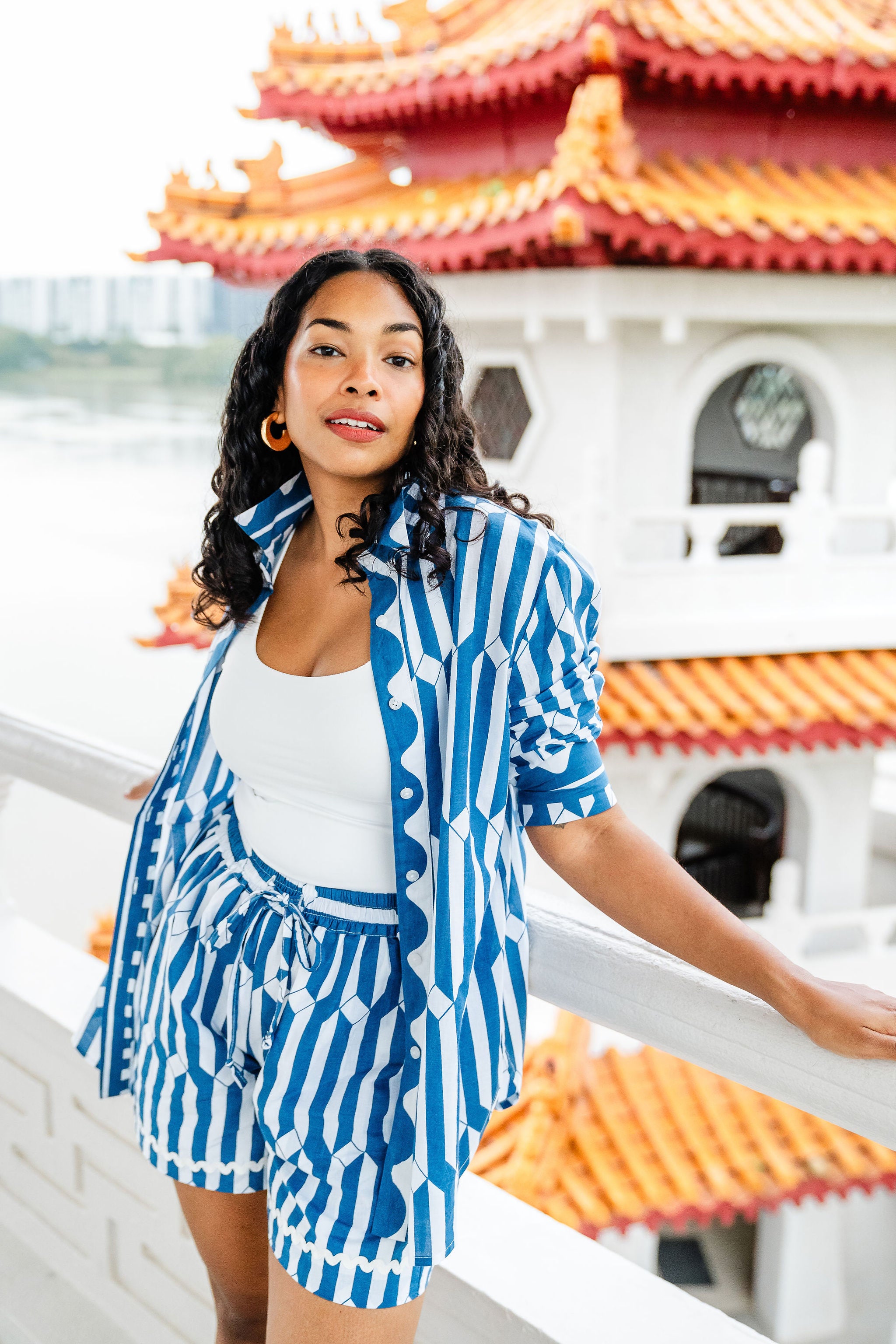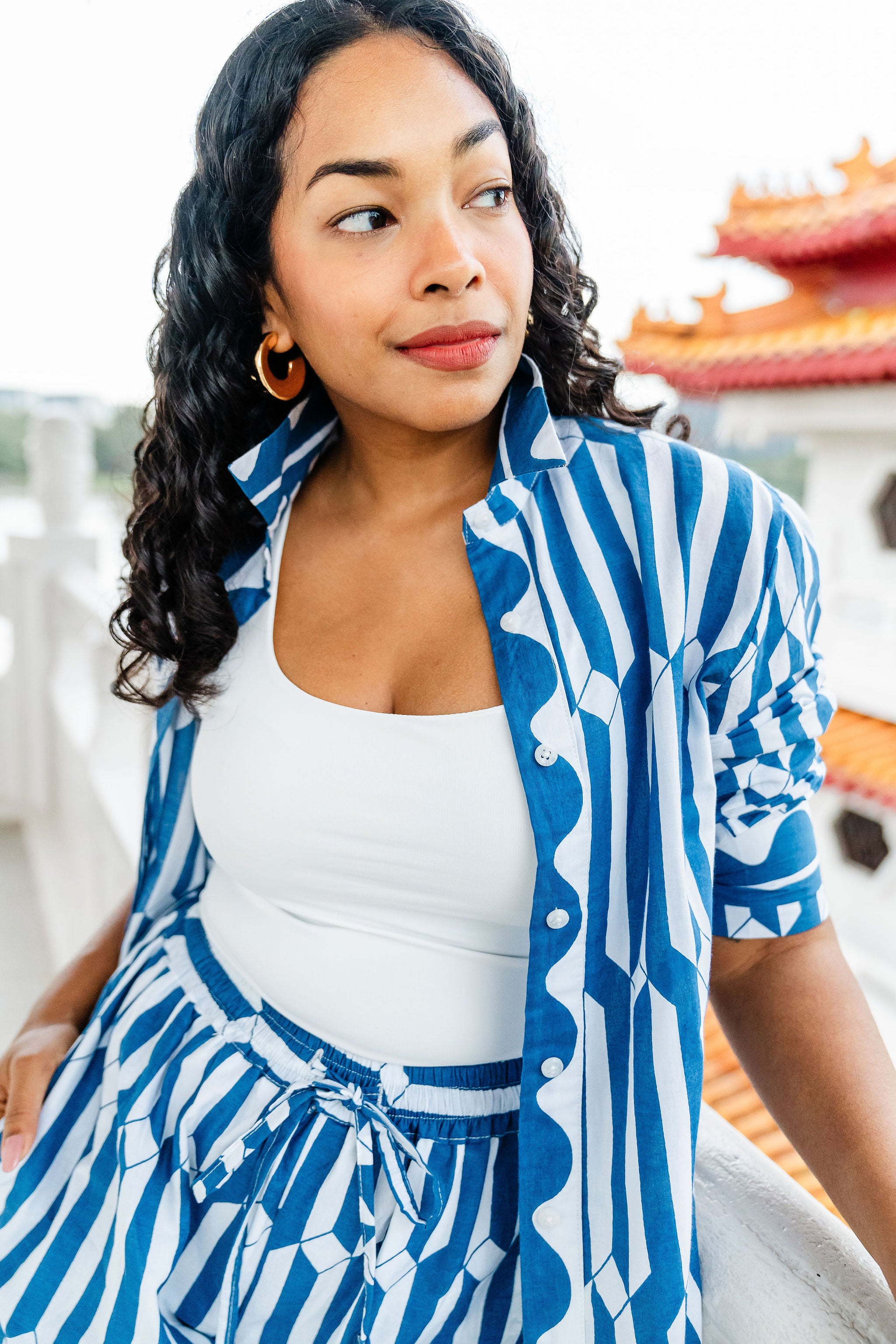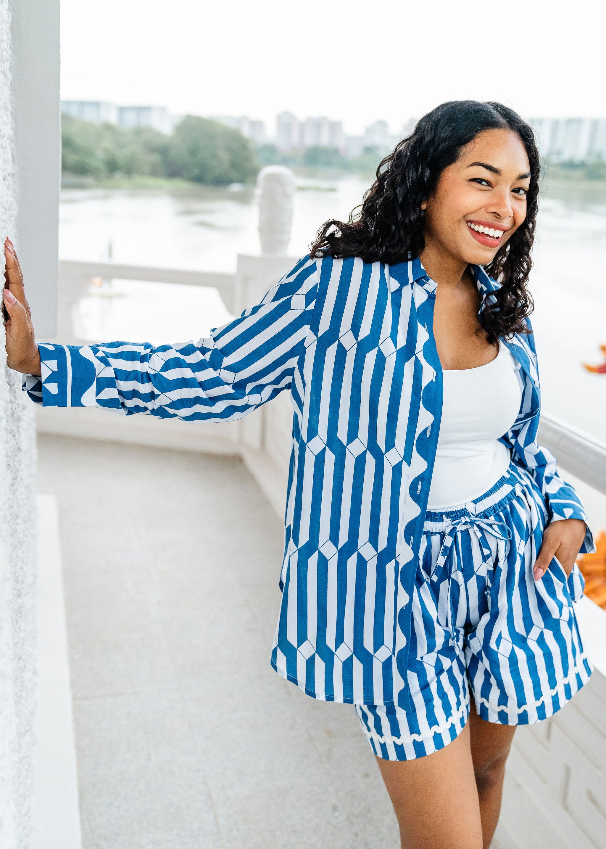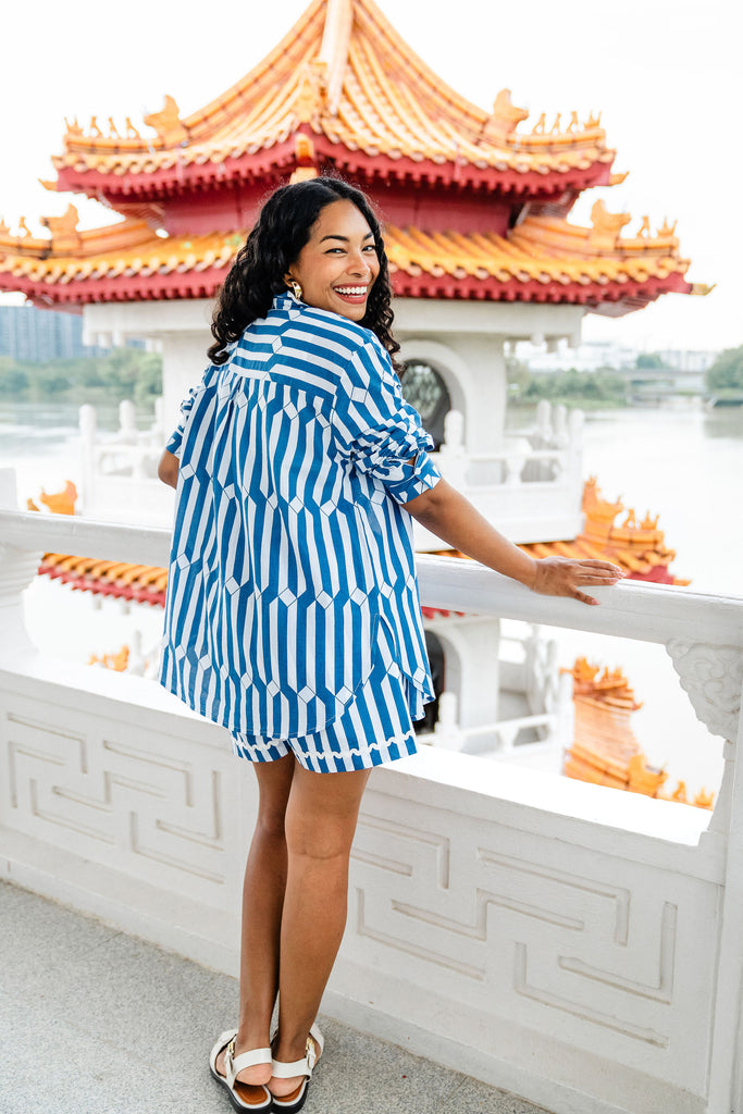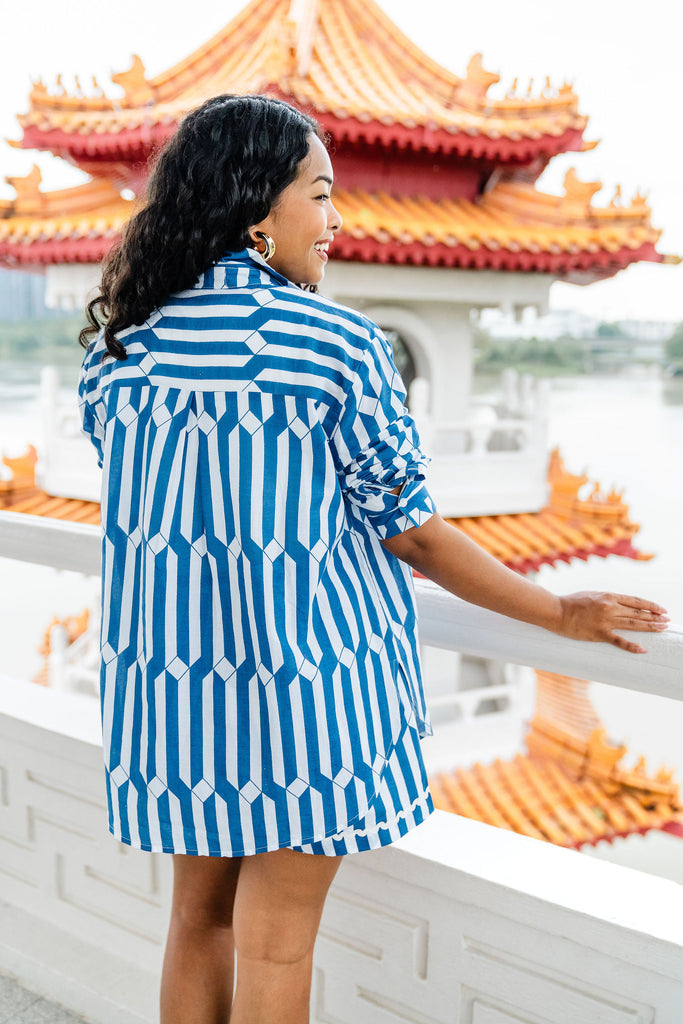A classic block printed loose fit collared shirt with long sleeves and a button-up front. Can be paired with jeans, over a dress or with swimwear.  This is a one size piece and looks great on all body types. The shirt looks lovely, tucked in or out.